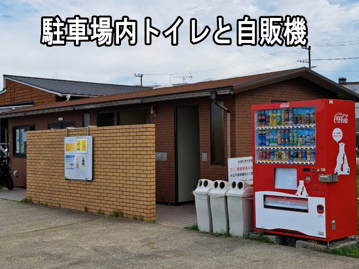 - 駐車場に併設されているトイレと自販機です。大型トイレはこちらだけになりますのでご注意ください。自販機にて船内持ち込み用の飲み物等も購入していただけます。